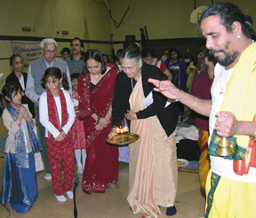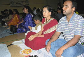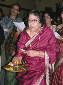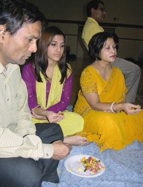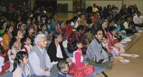 | and hope. An event marked with cheerful togetherness of families, relatives, friends, and acquaintances, Deepawali brings out expressions of love from devotees through chants, songs, and prayers to gods and goddesses; exchange of gifts; and sharing of traditional food and sweets. Local Hindus belonging to the American Hindu Association celebrated Deepawali on November 12 at Jefferson Middle School (Madison) with a special Lakshmi-Ganesh puja (the act of showing reverence to a god, a spirit, or another aspect of the divine through invocations, prayers, songs, and rituals) conducted by priests from the Hindu Temple of Wisconsin. An article from the Smithsonian Institution that explains the importance of puja says: An essential part of puja for the Hindu devotee is making a spiritual connection with the divine. Most often, that contact is facilitated through an object: an element of nature, a sculpture, a vessel, a painting, or a print. Wherever puja is performed, it includes three important components: the seeing of the deity; puja, or worship, which includes offering flowers, fruits, and foods; and retrieving the blessed food and consuming it. By performing these sacred acts, the worshiper creates a relationship with the divine through his or her emotions and senses. Puja is a multi-sensory experience. One observes the offering of the lighted lamps, touches the ritual objects and feet of the deity (where possible), hears the ringing of the bells and the sacred chants being recited, smells the incense, and tastes the blessed food offered at the end of the ritual. Hindu images are said to help devotees understand divinity. They are considered sacred and serve as visual metaphors to express the invisible divine reality. The priests in this particular event invoked the spirit of the gods to enter the images. For the duration of the ceremony, the images were thought to contain the divine beings' presence. Local devotees -- facing an altar with images of Lord Ganesha and Goddess Lakshmi and decorated with flowers and lights -- sat on blankets with plates of fresh flowers. In prayer, each of them held bits of petals and raised them just across their hearts. The worship ceremony included chants and sloka of Lord Ganesha, as well as bhajans or songs about the beauty of Lakshmi. They all stood in front of the altar and sang an Aarati. The sweet smell of incense permeated the air as each devotee approached the altar with a lighted lamp. To the Hindus, these lights will "remove darkness" in the world and guide their -- and our -- lives forever. A cultural program featuring religious dances from India and Nepal and a sumptuous meal for everyone were shared with families and guests alike. |
