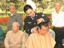 | A young volunteer trims hair of seniors at a center. | |||||||||||||||||||||||