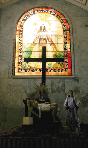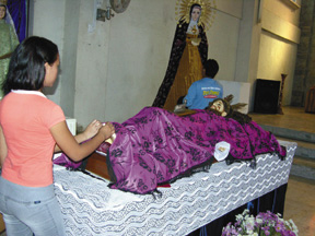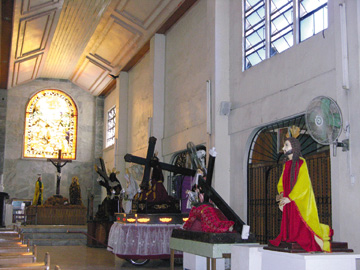 | I went inside the renovated church and saw that nothing much has changed. There was the life-size image of Jesus, the Nazarene, the Church's patron, lying down and covered with a an embroidered dark purplish silk blanket, handcrafted so well that one can guess the long hours spent to perfect it. People lined up to kiss the Nazarene's "bloodied" feet and hands, while others recited their novenas or the rosary before the figures of Mother Mary. The right aisle of the church facing the altar was lined with life-size images of Jesus. They are mounted on carts during processions. You see, in my hometown, evening processions are much-awaited community gatherings during religious festivals, such as Christmas, Easter, and saints' birthdays. The streets would brighten up with people in two rows carrying lighted candles, praying and singing, accompanied with a community brass band. The saints' images, wheeled between these rows and lighted with electric bulbs powered by generators, are said to remind the neighborhood to go to church, thank God for blessings, and praise Him by loving others and leading a Christian life. |