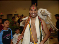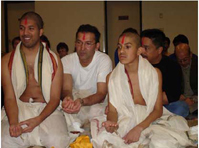 Upanayanam is a boy ritualistically becoming a man. The journey begins with the transition in a young man?s life with the Upanayanam Samskara or the sacred thread ceremony. The ceremony is usually performed for boys between the ages of 7 and 13. If, for some reason, it has not been done by then, it needs to be completed before he gets married. This initiation rite marks his second spiritual birth after his first physical one, for not only is he now admitted to the privileges of his caste and into society, but also embarks on adolescence. "It means not just culture, but it holds a deep and pure reason to create a good human being, a good family, a good society, a good nation, and thus a good world to live in." Upanayanam is also the rite in which a young boy is initiated into the Gayatri -- the holiest of all mantras in the legacy of the guru. Traditionally, an auspicious time and date was chosen to shave the boy's head completely, leaving only a small tuft in the center of the scalp, called a Tupi. Among other things, this is the passing of the child's care from his parents to his guru. The boy sits on his guru's left and promises to obey all the orders that he will be given. Both their hands are then covered with a long cloth and amid beating drums and sounding conches, the guru whispers into the right ear of the boy a mantra or words of wisdom, which are never repeated to anyone else. The sacred thread used for the ceremony consists of three or six strands depending on the caste one belongs to, joined by a knot known as Brahmagranthi or the knot of Brahma. The three strands symbolize the Hindu trinity -- Brahma, Vishnu, and Shiva. There are various interpretations of the three strands to represent many of the other traits like Mahasarasvati, Mahalakshmi, and Mahakali; or the three qualities known as sattva, rajas and tamas; |